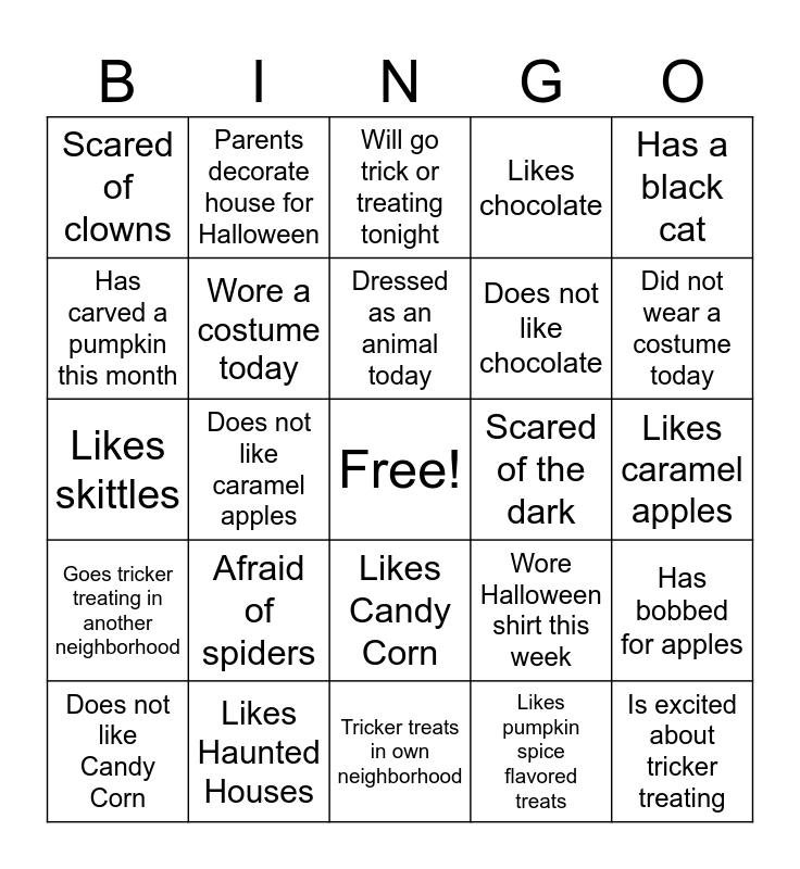This bingo card has a free space and 24 words: Afraid of spiders, Likes Haunted Houses, Dressed as an animal today, Does not like Candy Corn, Has a black cat, Scared of clowns, Has carved a pumpkin this month, Parents decorate house for Halloween, Scared of the dark, Likes Candy Corn, Does not like chocolate, Likes skittles, Wore Halloween shirt this week, Has bobbed for apples, Wore a costume today, Likes pumpkin spice flavored treats, Likes caramel apples, Will go trick or treating tonight, Did not wear a costume today, Does not like caramel apples, Is excited about tricker treating, Goes tricker treating in another neighborhood, Likes chocolate and Tricker treats in own neighborhood.