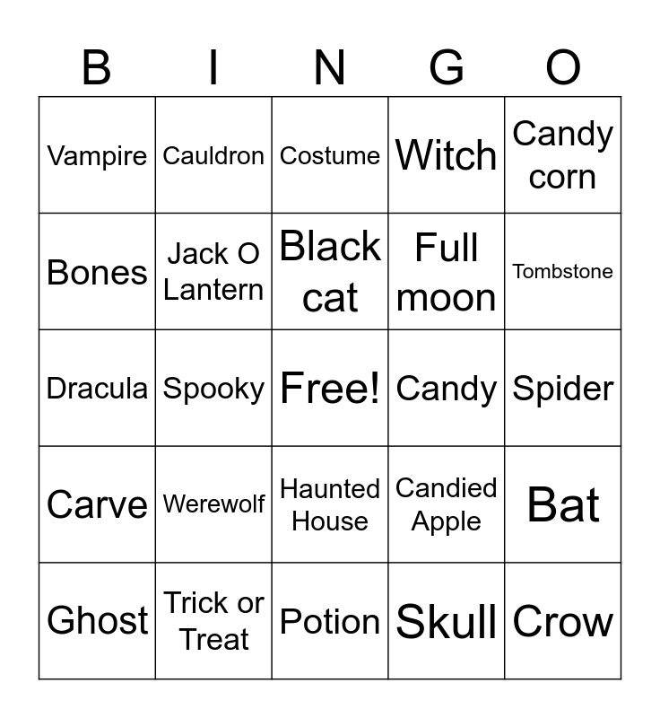 This bingo card has a free space and 29 words: Ghost, Pumpkin, Spooky, Skeleton, Vampire, Costume, Jack O Lantern, Werewolf, Candy, Trick or Treat, Spider, Crow, Potion, Skull, Tombstone, Halloween, Haunted House, Carve, Candy corn, Dracula, Candied Apple, Night, Full moon, Bones, Witch, Cauldron, Bat, Black cat and Scarecrow.