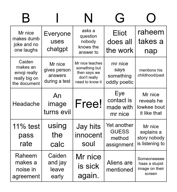 This bingo card has a free space and 35 words: Document is shared with half the class, Caiden puts stupid image in google doc, Lucy does nothing, Mr nice gives person answers during a test, Jay hits innocent soul, Eliot does all the work, Caiden makes an emoji really really big on the document, Someone uses niche sign language, Mr nice teaches something but then says we don't really need to know it, mr nice makes a strange obscure drawing of a diagram that makes no sense, Headache, raheem takes a nap, tyler goons alot, discrimination/ separation, Mr nice makes dumb joke and no one laughs, Eye contact is made with mr nice, Aliens are mentioned, An image turns evil, 11% test pass rate, Someoneeeee haas a stupid image on their screen, Yet another GUESS method assignment, Raheem makes a noise in agreement, Mr nice explains a story nobody is listening to, Caiden and jay leave early, asks a question nobody knows the answer to, mentions his childhood/past, mentions his age, whole class starts clapping??, mr nice says something oddly poetic, Mr nice reveals he lowkee bout it like that, the senior guy gets like a 2 on the mcq, Mr nice is sick again., using the calc, Everyone uses chatgpt and Tyler vocal stims out loud.