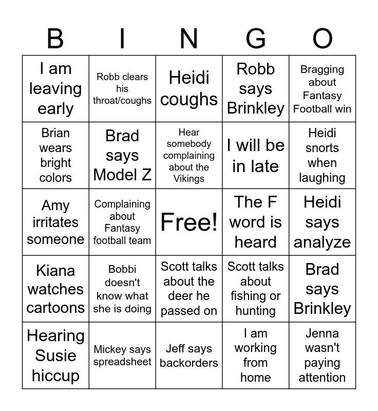 This bingo card has a free space and 48 words: Kim says that's what I got, Jenna wasn't paying attention, Kiana says service, Jeff says backorders, Bobbi doesn't know what she is doing, Scott talks about Rick, Robb clears his throat/coughs, Heidi says VCBs, Brian wears bright colors, Scott talks about material, Brad says Model Z, Robb says Brinkley, Brad says Brinkley, Scott talks about fishing or hunting, Scott talks about sports, CSR says help where needed, Hear somebody complaining about the Vikings, The F word is heard, Hear Packer Superbowl talk, Bragging about Fantasy Football win, Complaining about Fantasy football team, I am working from home, I am leaving early, I will be in late, My pet needs to go to the vet, Heidi snorts when laughing, Hearing Susie hiccup, Robb brings in a new recipe to share, Scott talks about the deer he passed on, Kiana watches cartoons, Bobbi gets upset by anybody, Jenna gets above 80 decibels, Shelly drops in an order, Brian says shipped, Mickey says spreadsheet, Robb says spreadsheet, Someone says something preposterous, Heidi says analyze, Robb says Model G, Production or shipping have problems, Heidi calls you on teams while in office, Jenna says service, Heidi coughs, Rick irritates someone, Amy irritates someone, Amy sends a vague email, Jeff talks smack and Bobbi's cell phone rings.