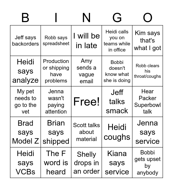 This bingo card has a free space and 47 words: Kiana watches cartoons, Bobbi gets upset by anybody, Jenna gets above 80 decibels, Shelly drops in an order, Brian says shipped, Mickey says spreadsheet, Robb says spreadsheet, Someone says something preposterous, Heidi says analyze, Robb says Model G, Production or shipping have problems, Heidi calls you on teams while in office, Jenna says service, Heidi coughs, Rick irritates someone, Amy irritates someone, Amy sends a vague email, Jeff talks smack, Bobbi's cell phone rings, Kim says that's what I got, Jenna wasn't paying attention, Kiana says service, Jeff says backorders, Bobbi doesn't know what she is doing, Scott talks about Rick, Robb clears his throat/coughs, Heidi says VCBs, Brian wears bright colors, Scott talks about material, Brad says Model Z, Robb says Brinkley, Brad says Brinkley, Scott talks about fishing or hunting, Scott talks about sportsCSR says help where needed, Hear somebody complaining about the Vikings, The F word is heard, Hear Packer Superbowl talk, Bragging about Fantasy Football win, Complaining about Fantasy football team, I am working from home, I am leaving early, I will be in late, My pet needs to go to the vet, Heidi snorts when laughing, Hearing Susie hiccup, Robb brings in a new recipe to share and Scott talks about the deer he passed on.