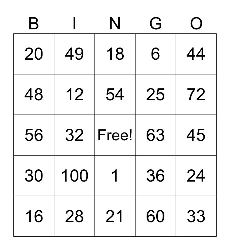 This bingo card has a free space and 24 words: 100, 28, 54, 16, 44, 20, 48, 49, 63, 1, 25, 56, 36, 24, 12, 60, 45, 18, 72, 32, 33, 30, 6 and 21.