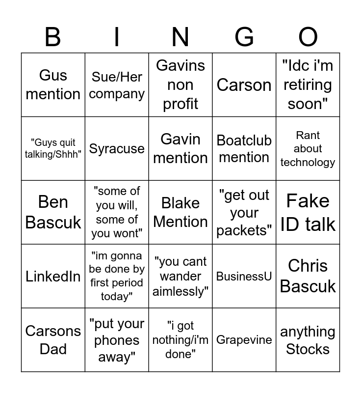 This bingo card has a free space and 27 words: BusinessU, BPA, Boatclub mention, "i got nothing/i'm done", "Guys quit talking/Shhh", Gavins non profit, Sue/Her company, LinkedIn, "get out your packets", Chris Bascuk, Ben Bascuk, Carson, Carsons Dad, "put your phones away", Rant about technology, Networking advice, Syracuse, Gavin mention, "im gonna be done by first period today", Gus mention, Fake ID talk, Grapevine, "some of you will, some of you wont", anything Stocks, "you cant wander aimlessly", "Idc i'm retiring soon" and "rule of thumb".