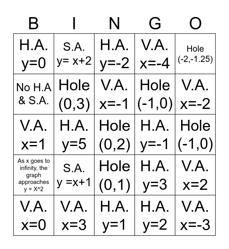 This bingo card has 25 words: S.A. y =x+1, H.A. y=1, V.A. x=-1, V.A. x=0, Hole (-2,-1.25), H.A. y=0, No H.A & S.A., S.A. y= x+2, H.A. y=-1, Hole (0,1), Hole (-1,0), V.A. x=1, H.A. y=3, V.A. x=2, Hole (0,3), V.A. x=-3, Hole (-1,0), H.A. y=-2, V.A. x=-2, H.A. y=5, Hole (0,2), V.A. x=3, As x goes to infinity, the graph approaches y = X^2, V.A. x=-4 and H.A. y=2.