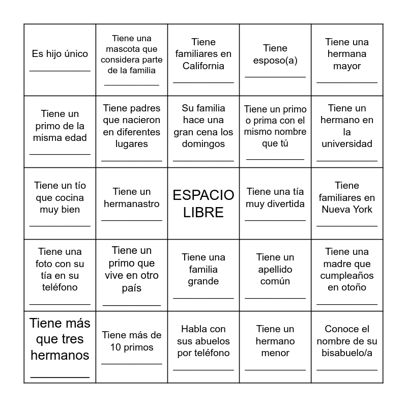This bingo card has a free space and 24 words: Tiene más que tres hermanos ________, Tiene un primo que vive en otro país __________, Su familia hace una gran cena los domingos ___________, Tiene un hermano menor ___________, Tiene una hermana mayor ___________, Es hijo único ___________, Tiene una mascota que considera parte de la familia ___________, Tiene familiares en California ___________, Tiene una tía muy divertida ___________, Tiene familiares en Nueva York ___________, Tiene un tío que cocina muy bien ___________, Tiene padres que nacieron en diferentes lugares ___________, Tiene un apellido común ___________, Tiene una madre que cumpleaños en otoño ___________, Tiene un primo de la misma edad ___________, Tiene más de 10 primos ___________, Habla con sus abuelos por teléfono ___________, Tiene esposo(a) ___________, Tiene un hermano en la universidad ___________, Tiene una foto con su tía en su teléfono ___________, Tiene un hermanastro ___________, Tiene una familia grande ___________, Tiene un primo o prima con el mismo nombre que tú ___________ and Conoce el nombre de su bisabuelo/a ___________.