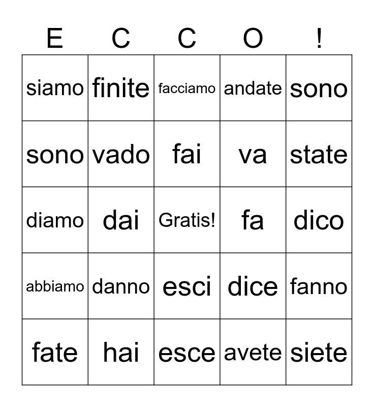 This bingo card has a free space and 60 words: ho, hai, ha, abbiamo, avete, hanno, vado, vai, va, andiamo, andate, vanno, sono, sei, è, siamo, siete, sono, faccio, fai, fa, facciamo, fate, fanno, sto, stai, sta, stiamo, state, stanno, finisco, finisci, finisce, finiamo, finite, finiscono, do, dai, dà, diamo, date, danno, dico, dici, dice, diciamo, dite, dicono, esco, esci, esce, usciamo, uscite, escono, vengo, vieni, viene, veniamo, venite and vengono.