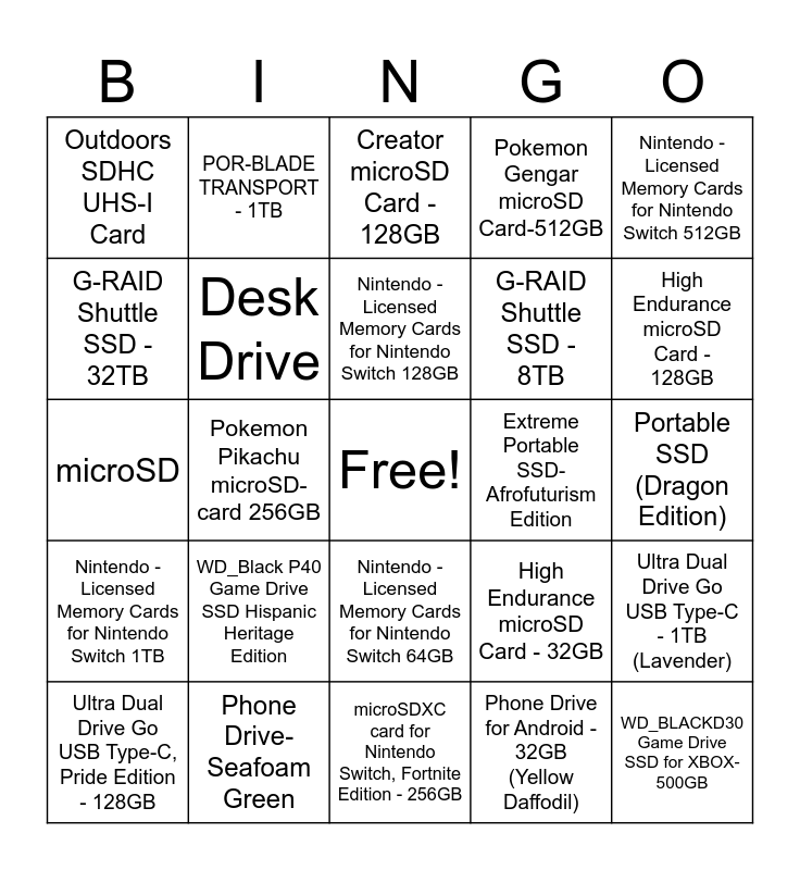 This bingo card has a free space and 40 words: Extreme PRO Portable SSD, microSD, Cruzer Blade, Desk Drive, Phone Drive-Seafoam Green, Nintendo -Licensed Memory Cards for Nintendo Switch 64GB, Nintendo -Licensed Memory Cards for Nintendo Switch 128GB, Nintendo -Licensed Memory Cards for Nintendo Switch 256GB, Nintendo -Licensed Memory Cards for Nintendo Switch 512GB, Nintendo -Licensed Memory Cards for Nintendo Switch 1TB, Pokemon Pikachu microSD-card 256GB, Pokemon Gengar microSD Card-512GB, WD_BLACKD30 Game Drive SSD for XBOX-500GB, Portable SSD (Dragon Edition), Extreme Portable SSD-Afrofuturism Edition, WD_Black P40 Game Drive SSD Hispanic Heritage Edition, Portable SSD: FIFA World Cup 2026 Edition, Outdoors SDHC UHS-I Card, Ultra microSD Card for Chromebook - 512GB, Creator microSD Card - 128GB, Ultra Dual Drive Go USB Type-C - 1TB (Lavender), Phone Drive for Android - 32GB (Yellow Daffodil), G-RAID Shuttle SSD - 8TB, G-RAID Shuttle SSD - 32TB, Fortnite Portable SSD, Peely Edition - 1TB, Fortnite USB FlashDrive, Peely Edition - 64GB, PRO-READER Multi Card, PRO-DOCK 4, ImageMate PRO USB-C, Pokemon Snorlax microSD Card-1TB, Smurfs USB Flash Drive - 64GB, Ultra Dual Drive Go USB Type-C, Pride Edition - 128GB, SN655 NVME SSD, High Endurance microSD Card - 32GB, High Endurance microSD Card - 128GB, microSDXC card for Nintendo Switch, Fortnite Edition - 256GB, microSD Express Card - 128GB, Video microSD card - 32GB, POR-BLADE TRANSPORT - 1TB and SSD Notebook Upgrade Tool Kit.