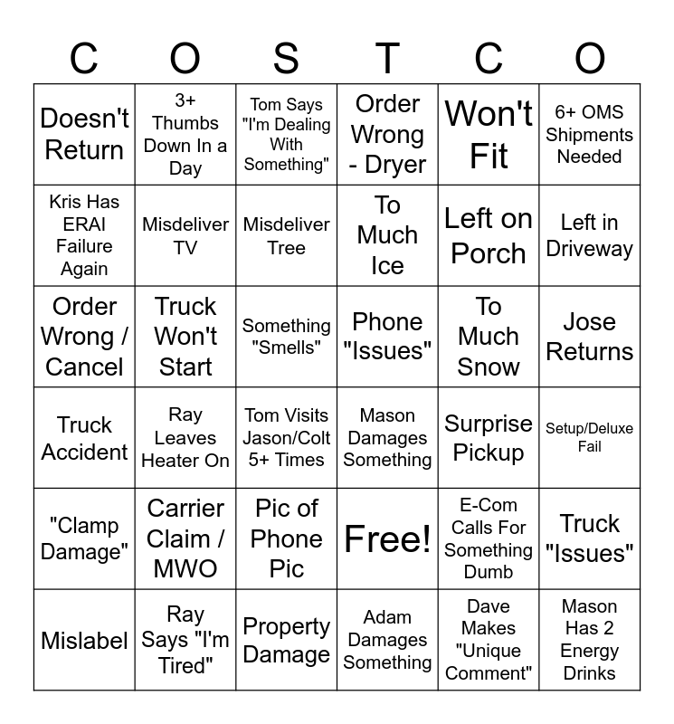 This bingo card has 36 words: Free!, Pic of Phone Pic, Adam Damages Something, Kris Has ERAI Failure Again, Truck Accident, Phone "Issues", Misdeliver TV, Property Damage, Won't Fit, E-Com Calls For Something Dumb, Left in Driveway, Order Wrong - Dryer, Truck "Issues", Truck Won't Start, To Much Ice, Doesn't Return, "Clamp Damage", To Much Snow, Order Wrong / Cancel, Tom Says "I'm Dealing With Something", Something "Smells", Ray Leaves Heater On, Mason Damages Something, Tom Visits Jason/Colt 5+ Times, Surprise Pickup, 3+ Thumbs Down In a Day, Left on Porch, Ray Says "I'm Tired", Misdeliver Tree, 6+ OMS Shipments Needed, Mason Has 2 Energy Drinks, Mislabel, Setup/Deluxe Fail, Jose Returns, Carrier Claim / MWO and Dave Makes "Unique Comment".