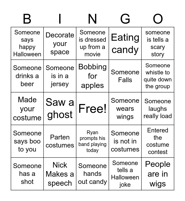 This bingo card has a free space and 24 words: Parten costumes, Nick Makes a speech, Bobbing for apples, Someone has a shot, someone is tells a scary story, Someone says happy Halloween, Someone drinks a beer, Decorate your space, Someone wears wings, Ryan prompts his band playing today, Someone Falls, Made your costume, Someone is not in costumes, Entered the costume contest, Someone is in a jersey, Someone tells a Halloween joke, Someone laughs really load, Someone is dressed up from a movie, Someone whistle to quite down the group, Saw a ghost, People are in wigs, Someone says boo to you, Eating candy and Someone hands out candy.
