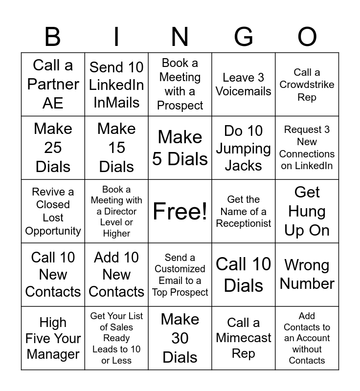 This bingo card has a free space and 24 words: Add 10 New Contacts, Get Your List of Sales Ready Leads to 10 or Less, Make 5 Dials, High Five Your Manager, Call a Crowdstrike Rep, Call a Partner AE, Make 25 Dials, Send 10 LinkedIn InMails, Get the Name of a Receptionist, Send a Customized Email to a Top Prospect, Do 10 Jumping Jacks, Revive a Closed Lost Opportunity, Call 10 Dials, Wrong Number, Make 15 Dials, Call a Mimecast Rep, Get Hung Up On, Book a Meeting with a Prospect, Request 3 New Connections on LinkedIn, Book a Meeting with a Director Level or Higher, Add Contacts to an Account without Contacts, Call 10 New Contacts, Leave 3 Voicemails and Make 30 Dials.