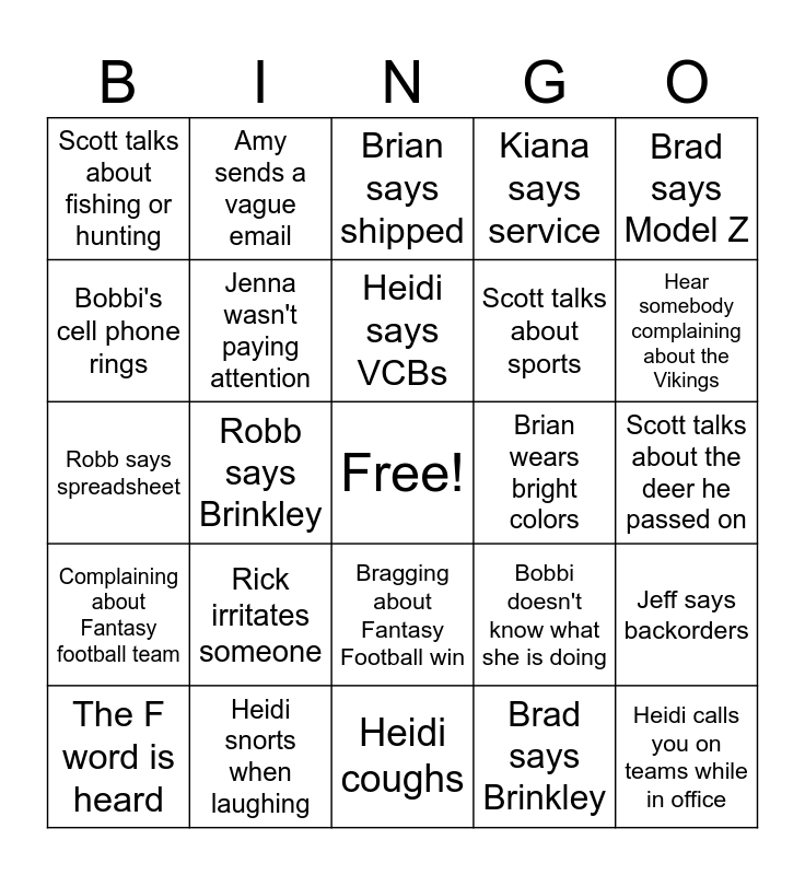 This bingo card has a free space and 48 words: Production or shipping have problems, Heidi calls you on teams while in office, Jenna says service, Heidi coughs, Rick irritates someone, Amy irritates someone, Amy sends a vague email, Jeff talks smack, Bobbi's cell phone rings, Kim says that's what I got, Jenna wasn't paying attention, Kiana says service, Jeff says backorders, Bobbi doesn't know what she is doing, Scott talks about Rick, Robb clears his throat/coughs, Heidi says VCBs, Brian wears bright colors, Scott talks about material, Brad says Model Z, Robb says Brinkley, Brad says Brinkley, Scott talks about fishing or hunting, Scott talks about sports, CSR says help where needed, Hear somebody complaining about the Vikings, The F word is heard, Hear Packer Superbowl talk, Bragging about Fantasy Football win, Complaining about Fantasy football team, I am working from home, I am leaving early, I will be in late, My pet needs to go to the vet, Heidi snorts when laughing, Hearing Susie hiccup, Robb brings in a new recipe to share, Scott talks about the deer he passed on, Kiana watches cartoons, Bobbi gets upset by anybody, Jenna gets above 80 decibels, Shelly drops in an order, Brian says shipped, Mickey says spreadsheet, Robb says spreadsheet, Someone says something preposterous, Heidi says analyze and Robb says Model G.