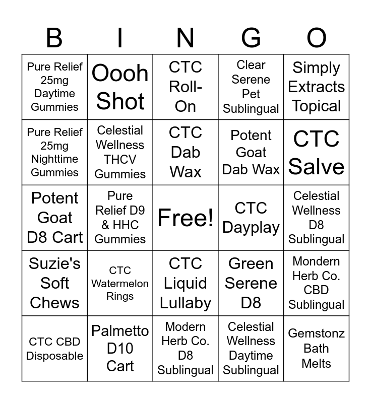 This bingo card has a free space and 24 words: CTC Watermelon Rings, Palmetto D10 Cart, CTC Dab Wax, CTC CBD Disposable, Simply Extracts Topical, Pure Relief 25mg Daytime Gummies, Pure Relief 25mg Nighttime Gummies, Oooh Shot, CTC Dayplay, CTC Liquid Lullaby, Potent Goat Dab Wax, Potent Goat D8 Cart, Green Serene D8, Mondern Herb Co. CBD Sublingual, Celestial Wellness THCV Gummies, Celestial Wellness Daytime Sublingual, Celestial Wellness D8 Sublingual, CTC Roll-On, CTC Salve, Pure Relief D9 & HHC Gummies, Gemstonz Bath Melts, Suzie's Soft Chews, Clear Serene Pet Sublingual and Modern Herb Co. D8 Sublingual.