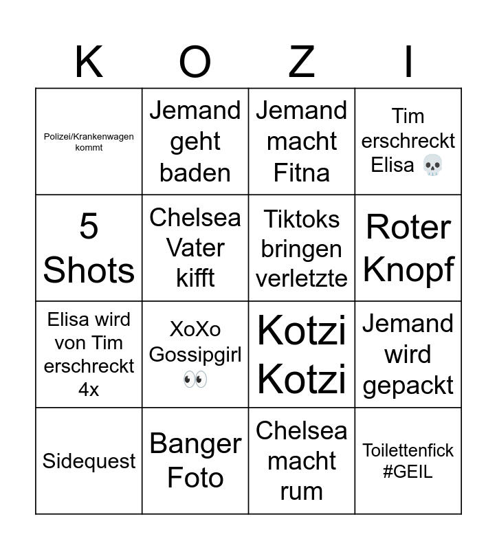 This bingo card has 19 words: Kotzi Kotzi, Mische des Todes, Jemand macht Fitna, Toilettenfick #GEIL, Jemand wird gepackt, 5 Shots, Chelsea macht rum, Polizei/Krankenwagen kommt, Jemand geht baden, Elisa wird von Tim erschreckt 4x, XoXo Gossipgirl 👀, Chelsea Vater kifft, Tiktoks bringen verletzte, Banger Foto, Sidequest, Etwas geht kaputt, Tim erschreckt Elisa 💀, Roter Knopf and Irgendjemand unerwartetes schlabbert rum 💦.