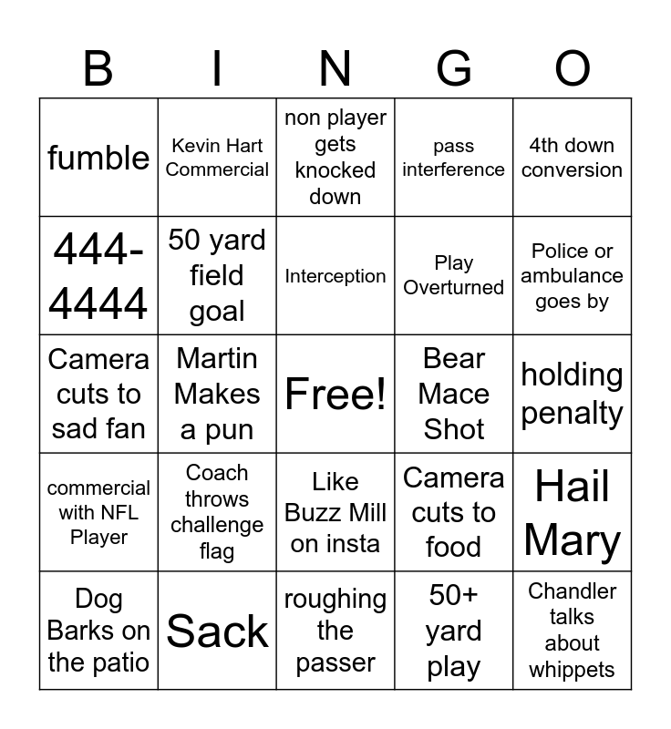 This bingo card has a free space and 24 words: Coach throws challenge flag, Sack, Interception, Dog Barks on the patio, 4th down conversion, fumble, 444-4444, Kevin Hart Commercial, Bear Mace Shot, Like Buzz Mill on insta, Play Overturned, Camera cuts to sad fan, Camera cuts to food, Hail Mary, 50 yard field goal, 50+ yard play, holding penalty, non player gets knocked down, Police or ambulance goes by, Martin Makes a pun, Chandler talks about whippets, commercial with NFL Player, pass interference and roughing the passer.
