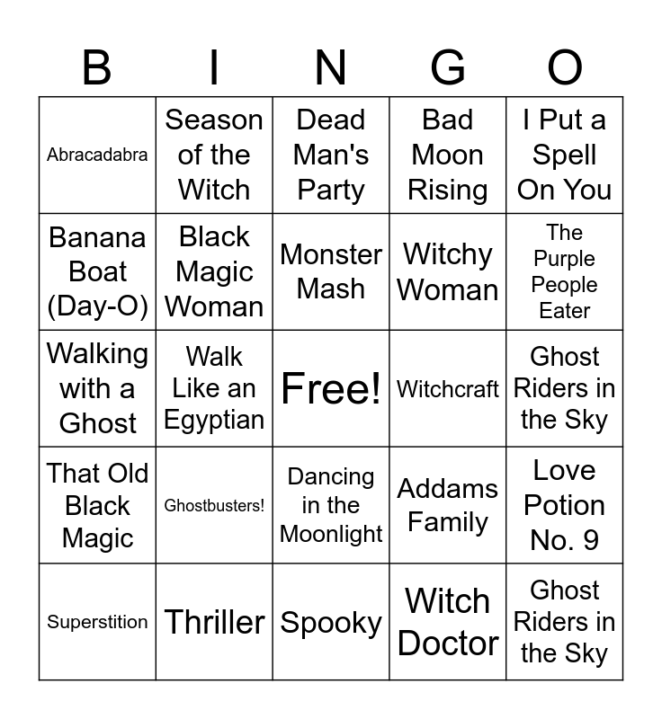 This bingo card has a free space and 24 words: Ghostbusters!, Thriller, Monster Mash, Superstition, I Put a Spell On You, Abracadabra, Banana Boat (Day-O), Season of the Witch, Witchcraft, Dancing in the Moonlight, Witchy Woman, Walking with a Ghost, Addams Family, Love Potion No. 9, Black Magic Woman, Witch Doctor, Ghost Riders in the Sky, Dead Man's Party, The Purple People Eater, Walk Like an Egyptian, Ghost Riders in the Sky, That Old Black Magic, Bad Moon Rising and Spooky.