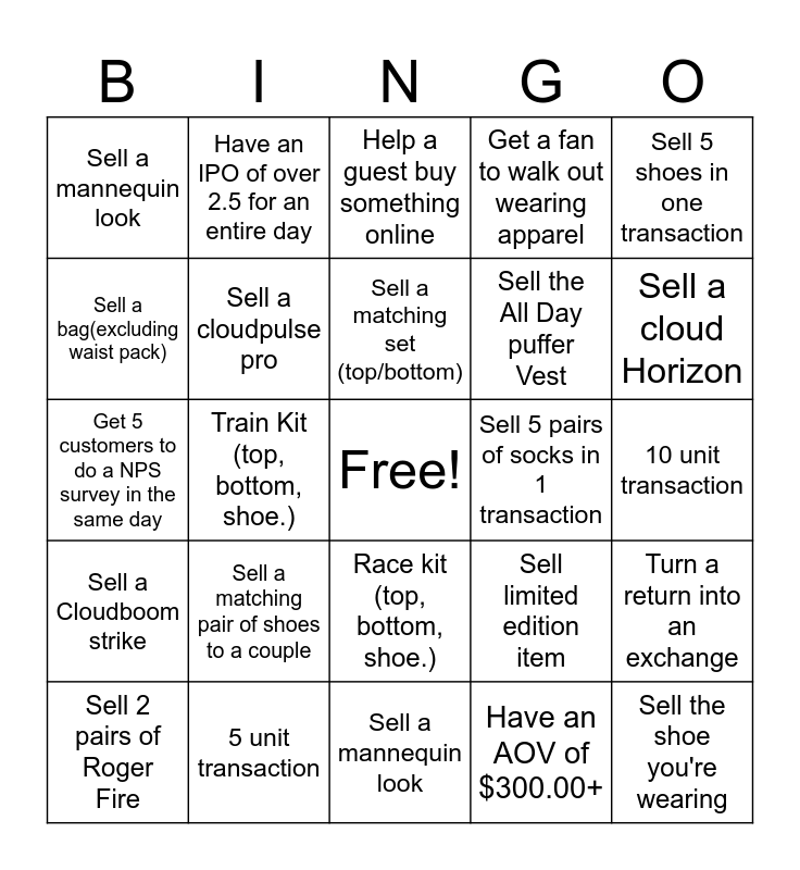 This bingo card has a free space and 24 words: Sell a matching pair of shoes to a couple, 5 unit transaction, Sell a matching set (top/bottom), Sell 2 pairs of Roger Fire, Sell 5 shoes in one transaction, Sell a mannequin look, Sell a bag(excluding waist pack), Have an IPO of over 2.5 for an entire day, Sell 5 pairs of socks in 1 transaction, Race kit (top, bottom, shoe.), Sell the All Day puffer Vest, Get 5 customers to do a NPS survey in the same day, Sell limited edition item, Turn a return into an exchange, Sell a cloudpulse pro, Have an AOV of $300.00+, 10 unit transaction, Help a guest buy something online, Sell a cloud Horizon, Train Kit (top, bottom, shoe.), Sell the shoe you're wearing, Sell a Cloudboom strike, Get a fan to walk out wearing apparel and Sell a mannequin look.