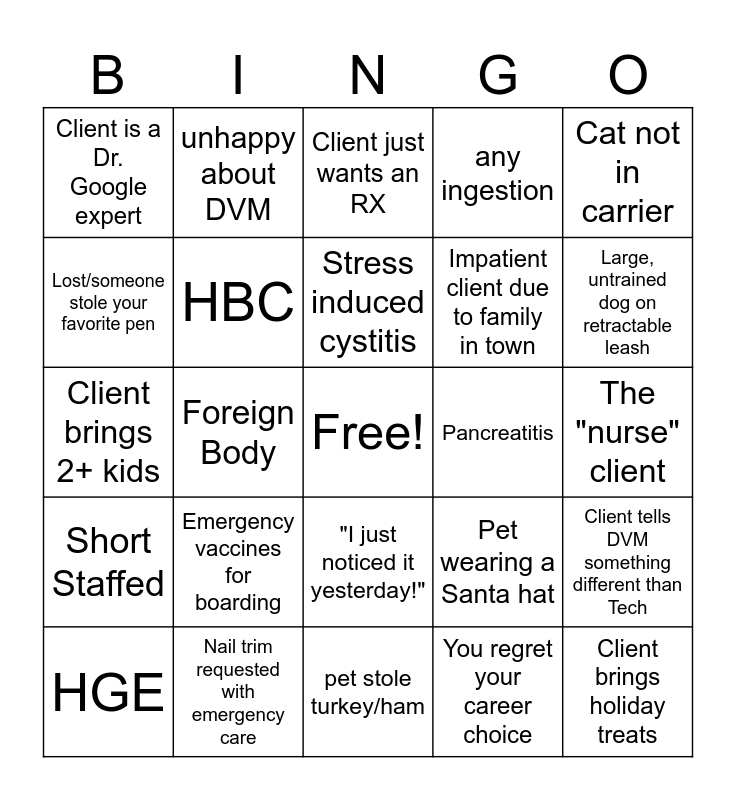 This bingo card has a free space and 29 words: HGE, Chocolate Toxicity, Foreign Body, Blocked Cat, Client is a Dr. Google expert, Client just wants an RX, HBC, Emergency vaccines for boarding, Pancreatitis, Nail trim requested with emergency care, The "nurse" client, Client brings holiday treats, pet stole turkey/ham, You regret your career choice, Large, untrained dog on retractable leash, Fleas, "I just noticed it yesterday!", Short Staffed, Cat not in carrier, Client brings 2+ kids, Pet wearing a Santa hat, Screaming brachycephalic dog, Impatient client due to family in town, Lost/someone stole your favorite pen, any ingestion, unhappy about DVM, Client tells DVM something different than Tech, Stress induced cystitis and husband fed the dog.