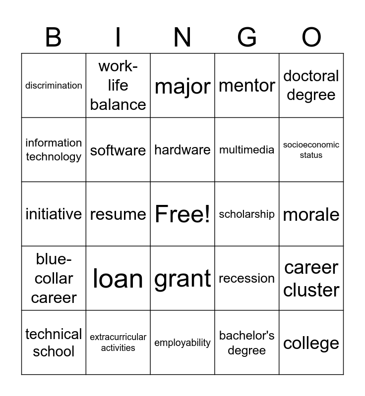 This bingo card has a free space and 44 words: university, college, junior college, technical school, associate degree, bachelor's degree, major, master's degree, doctoral degree, extracurricular activities, mentor, scholarship, grant, loan, work-study program, employability, employability skills, initiative, lifestyle, socioeconomic status, work-life balance, burnout, leisure, discrimination, glass ceiling, morale, stereotype, economy, recession, blue-collar career, white-collar career, career cluster, lifelong learning, career ladder, resume, portfolio, abacus, freelancer, hardware, information technology, multimedia, network systems, software and systems integration.
