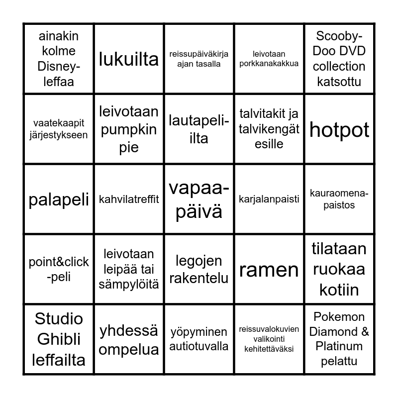This bingo card has 25 words: leivotaan leipää tai sämpylöitä, yöpyminen autiotuvalla, lautapeli-ilta, Studio Ghibli leffailta, Scooby-Doo DVD collection katsottu, ainakin kolme Disney-leffaa, vaatekaapit järjestykseen, lukuilta, karjalanpaisti, legojen rakentelu, talvitakit ja talvikengät esille, palapeli, ramen, tilataan ruokaa kotiin, leivotaan pumpkin pie, Pokemon Diamond & Platinum pelattu, kauraomena- paistos, reissupäiväkirja ajan tasalla, hotpot, kahvilatreffit, vapaa- päivä, yhdessä ompelua, point&click -peli, leivotaan porkkanakakkua and reissuvalokuvien valikointi kehitettäväksi.