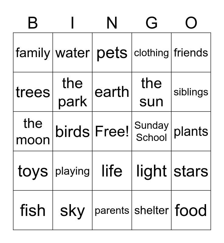 This bingo card has a free space and 26 words: life, shelter, earth, sky, friends, family, trees, water, plants, light, the sun, the moon, stars, fish, birds, humans, clothing, toys, pets, food, siblings, parents, Sunday School, playing, the park and temple.