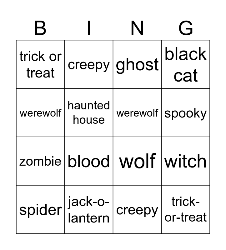 ⚠ This card has duplicate items: witch (3), ghost (3), black cat (4), pumpkin (3), skeleton (3), bat (3), mummy (3), monster (3), vampire (3), Dracula (3), wolf (3), werewolf (3), jack-o-lantern (3), candy (3), blood (3), haunted house (3), costume (3), cemetery (3), broom (3), zombie (3), spider (3), party (3), trick-or-treat (2), coffin (2), skull (2), creepy (2), spooky (2), scary (2), scream (2), dark (2)