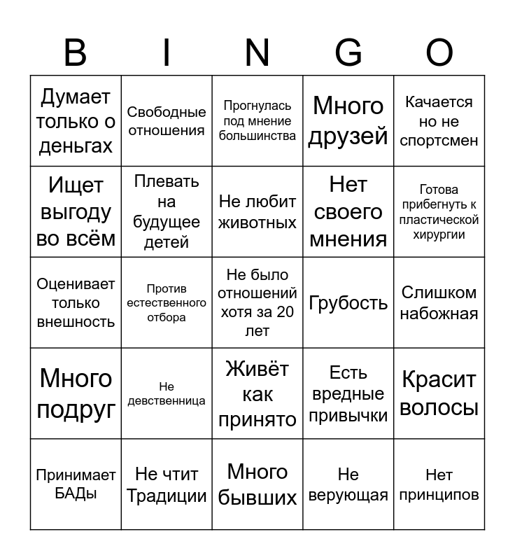 This bingo card has a free space and 24 words: Не девственница, Не чтит Традиции, Не любит животных, Принимает БАДы, Качается но не спортсмен, Думает только о деньгах, Ищет выгоду во всём, Свободные отношения, Грубость, Живёт как принято, Нет своего мнения, Оценивает только внешность, Есть вредные привычки, Красит волосы, Плевать на будущее детей, Не верующая, Слишком набожная, Прогнулась под мнение большинства, Готова прибегнуть к пластической хирургии, Против естественного отбора, Нет принципов, Много подруг, Много друзей and Много бывших.