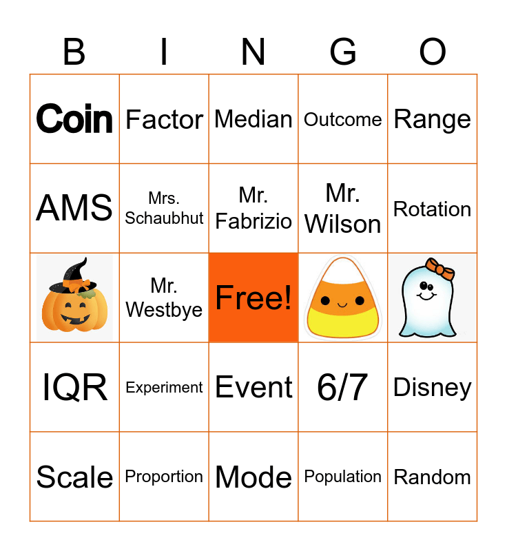 This bingo card has 7 images, a free space and 37 words: Random, Probability, Scale, Sample, Population, Median, Mean, Range, Proportion, Outcome, Event, Experiment, Reflection, Mode, Dice, Greatest, Rotation, Factor, Multiple, Least, Coin, 6/7, IQR, 74, Disney, MAD, Happy Halloween!, Mr. Westbye, Ms. Shaw, Mrs. Begin, Mrs. Langlois, Mr. Fabrizio, AMS, Mr. Wilson, Mrs. Keep, Mrs. Schaubhut and SPOOKY.