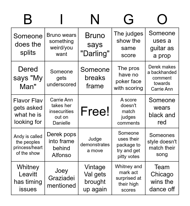 This bingo card has a free space and 24 words: Derek pops into frame behind Alfonso, Joey Graziadei mentioned, Someone breaks frame, Whitney Leavitt has timing issues, Someone uses a guitar as a prop, Someone does the splits, Dered says "My Man", Bruno wears something weird/you want, A score doesn't match judges comments, Judge demonstrates a move, The pros have no poker face with scoring, Flavor Flav gets asked what he is looking for, Someone uses their package to try and get pitty votes, Someones style doesn't match their song, Someone gets underscored, Whitney and mark act surprised at their high scores, Someone wears black and red, Bruno says "Darling", Derek makes a backhanded comment towards Carrie Ann, Carrie Ann takes her insecurities out on Danielle, Team Chicago wins the dance off, Andy is called the peoples princess/heart of the show, The judges show the same score and Vintage Val gets brought up again.