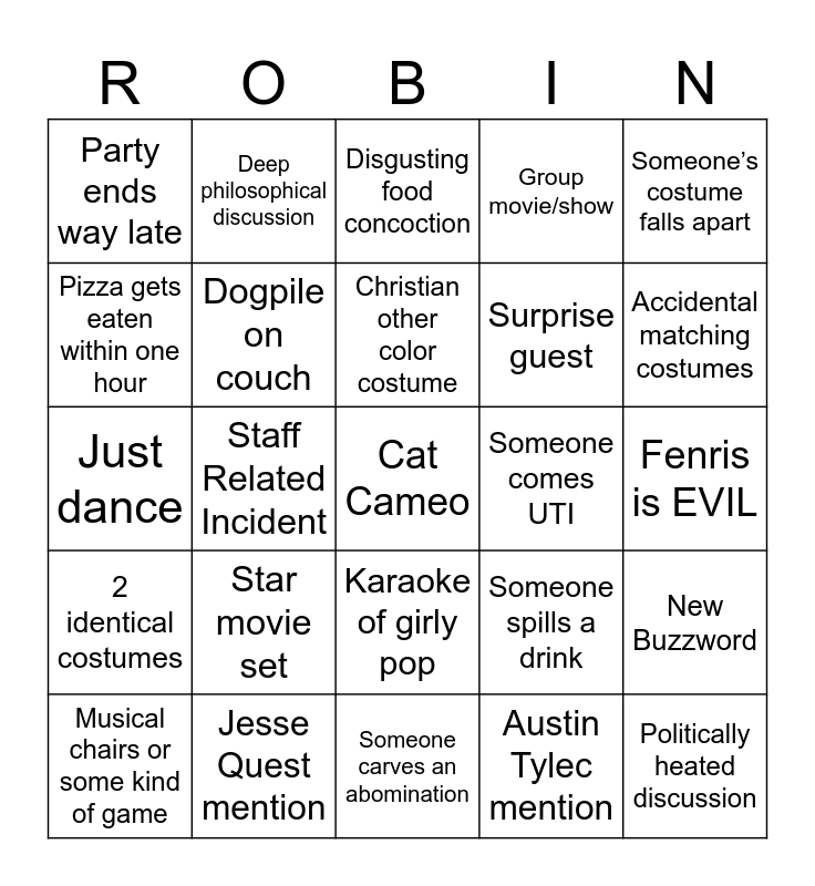 This bingo card has a free space and 24 words: Star movie set, Jesse Quest mention, Christian other color costume, Musical chairs or some kind of game, Someone’s costume falls apart, Party ends way late, Pizza gets eaten within one hour, Deep philosophical discussion, Someone comes UTI, Karaoke of girly pop, Surprise guest, Just dance, Someone spills a drink, New Buzzword, Dogpile on couch, Austin Tylec mention, Fenris is EVIL, Disgusting food concoction, Accidental matching costumes, Staff Related Incident, Politically heated discussion, 2 identical costumes, Group movie/show and Someone carves an abomination.