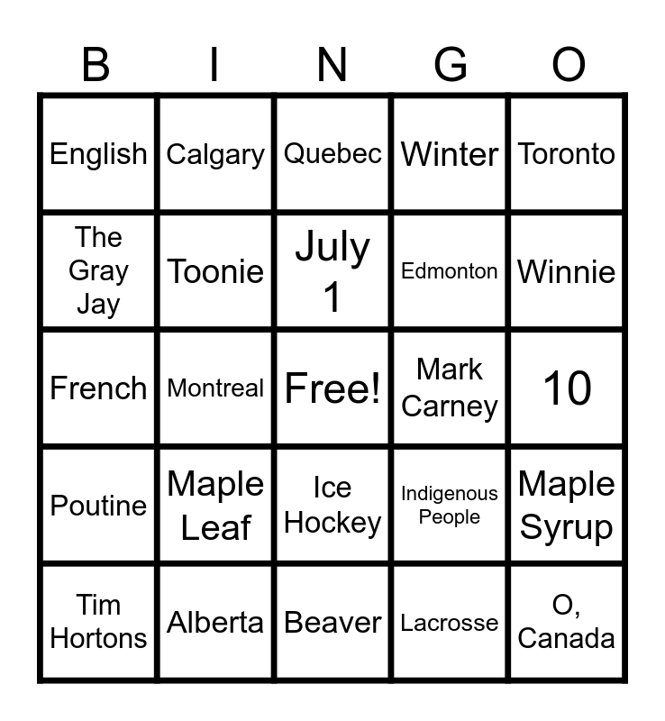 This bingo card has a free space and 24 words: Maple Leaf, Alberta, July 1, Tim Hortons, Toronto, English, The Gray Jay, Calgary, Mark Carney, Ice Hockey, Edmonton, French, Indigenous People, Maple Syrup, Toonie, Lacrosse, 10, Quebec, Winnie, Montreal, O, Canada, Poutine, Winter and Beaver.