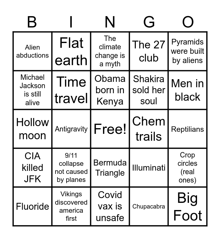 This bingo card has a free space and 29 words: Avril is a clone, Vikings discovered america first, The climate change is a myth, Government is working with aliens, Pyramids were built by aliens, Alien abductions, Time travel, Obama born in Kenya, Chem trails, Crop circles (real ones), Fluoride, Antigravity, Chupacabra, Big Foot, Hollow moon, Pyramids are power plants, Covid vax is unsafe, Illuminati, Men in black, CIA killed JFK, 9/11 collapse not caused by planes, The Simpsons predict the future, Shakira sold her soul, Reptilians, Michael Jackson is still alive, Flat earth, Bermuda Triangle, The 27 club and USA creates biological weapons.