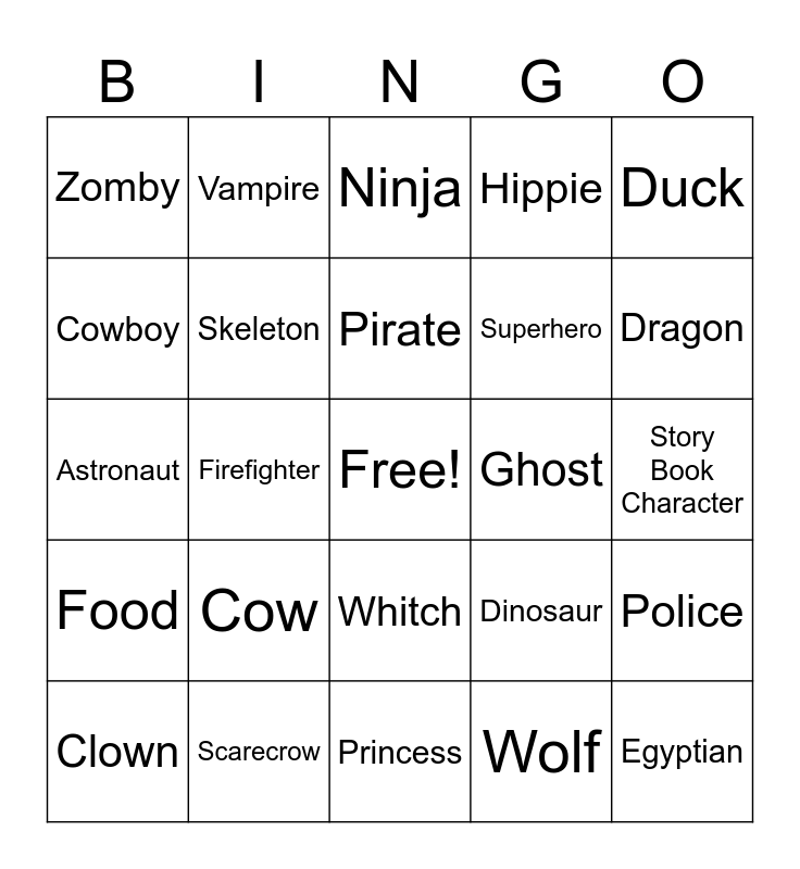 This bingo card has a free space and 24 words: Cow, Scarecrow, Pirate, Clown, Duck, Zomby, Cowboy, Vampire, Ghost, Whitch, Superhero, Astronaut, Dinosaur, Police, Skeleton, Wolf, Story Book Character, Ninja, Dragon, Firefighter, Egyptian, Food, Hippie and Princess.
