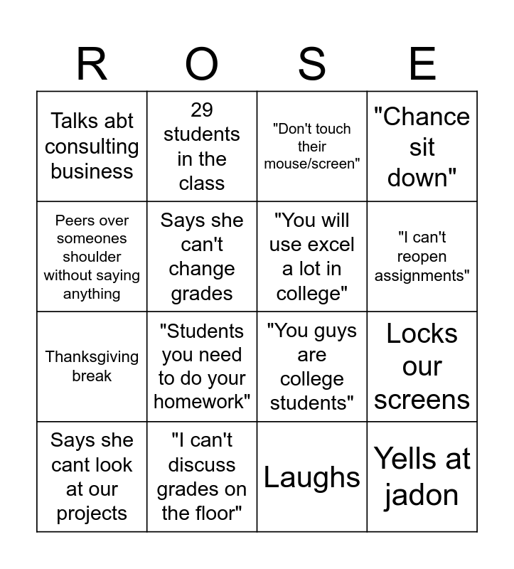 This bingo card has 19 words: "You guys are college students", Students, "Don't touch their mouse/screen", Yells at jadon, Locks our screens, Peers over someones shoulder without saying anything, Laughs, Talks abt consulting business, 29 students in the class, Thanksgiving break, "Students you need to do your homework", Says she can't change grades, "You will use excel a lot in college", "I can't discuss grades on the floor", Says she cant look at our projects, Gets mad at something mundane, "Chance sit down", "I can't reopen assignments" and "What did you get on the project?".