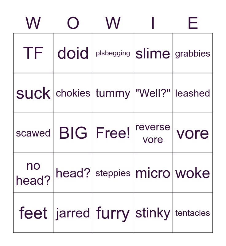 This bingo card has a free space and 39 words: big AND round, implied vore, milk, chokies, feet, steppies, tummy, WAHUH moment, grabbies, no head?, BIG, slime, tentacles, vore, reverse vore, head?, sus, TF, bondage, micro, suck, furry, "Well?", leashed, betrayal, "HEEEELP", yummers moment, slop slop, lore drop, doid, wisdom, Life, plsbegging, jarred, stinky, birthed, woke, scawed and buddy.