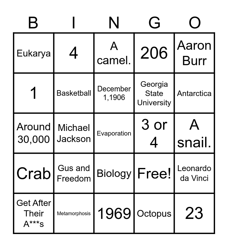 This bingo card has 25 words: Gus and Freedom, 1969, December 1,1906, Get After Their A***s, Aaron Burr, Eukarya, 1, 4, 3 or 4, Biology, Georgia State University, Around 30,000, Free!, Leonardo da Vinci, Basketball, 23, A snail., A camel., Antarctica, Michael Jackson, Evaporation, Metamorphosis, Crab, 206 and Octopus.