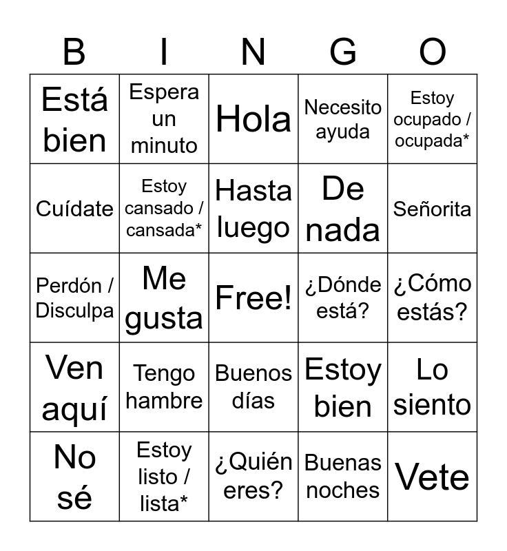 This bingo card has a free space and 26 words: Buenos días, Buenas noches, Hasta luego, Estoy listo / lista*, Estoy ocupado / ocupada*, Está bien, Cuídate, Espera un minuto, ¿Cómo estás?, Estoy bien, De nada, Perdón / Disculpa, Lo siento, No sé, Me gusta, Te quiero / Te amo, Necesito ayuda, Ven aquí, Hola, Vete, Señorita, ¿Quién eres?, ¿Dónde está?, Tengo hambre, Estoy cansado / cansada* and Ten Cuidado.