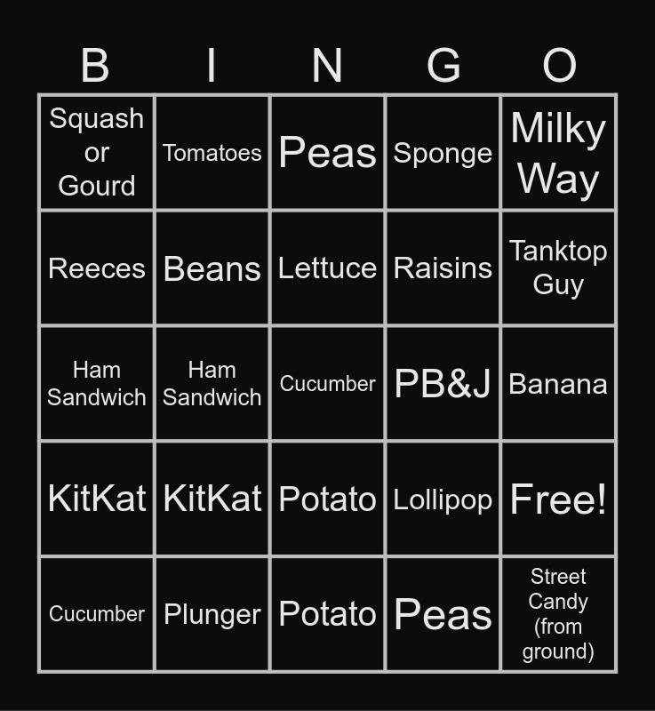 ⚠ This card has duplicate items: Tanktop Guy (2), Cucumber (2), M&M's (2), Potato (2), KitKat (2), Pretzels (2), Tomatoes (2), Kikko One Hitter (2), Reeces (2), Plunger (2), Beans (2), Sponge (2), Lollipop (2), Banana (2), Twix (2), Lettuce (2), PB&J (2), Street Candy (from ground) (2), Milky Way (2), Ham Sandwich (2), Peas (2), Squash or Gourd (2), Raisins (2), Pokemon cards (2)
