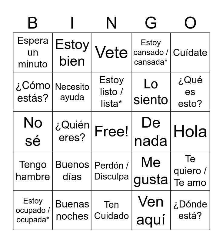 This bingo card has a free space and 24 words: Buenos días, Buenas noches, Estoy listo / lista*, Estoy ocupado / ocupada*, Cuídate, Espera un minuto, ¿Cómo estás?, Estoy bien, De nada, Perdón / Disculpa, Lo siento, No sé, Me gusta, Te quiero / Te amo, Necesito ayuda, Ven aquí, Hola, Vete, ¿Qué es esto?, ¿Quién eres?, ¿Dónde está?, Tengo hambre, Estoy cansado / cansada* and Ten Cuidado.