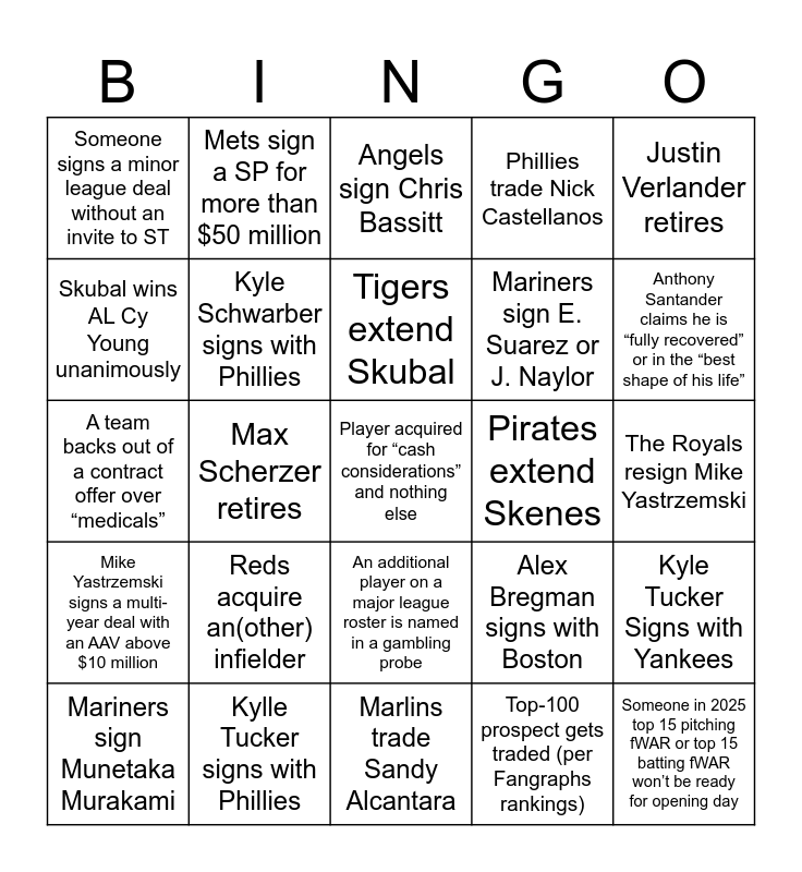 This bingo card has 51 words: Free!, Player acquired for “cash considerations” and nothing else, Dodgers sign free agent for more than $150 million, Marlins trade Sandy Alcantara, Reds acquire an(other) infielder, Reds trade a SP (one who made at 1 MLB start in 2025), Mets sign a SP for more than $50 million, Reverential off-season retrospective on Ohtani (Free Space), Skubal wins AL Cy Young unanimously, Reds do not sign a top-25 free agent (per MLBTR rankings), Kyle Schwarber signs with Phillies, Phillies trade Nick Castellanos, Kyle Tucker Signs with Yankees, Alex Bregman signs with Boston, Pete Alonso signs with Mets, Pete Alonso signs with Yankees, Tigers extend Skubal, Pirates extend Skenes, Trevor Rogers signs an extension of at least 3 years, Justin Verlander retires, Max Scherzer retires, Top-100 prospect gets traded (per Fangraphs rankings), Someone signs a minor league deal without an invite to ST, Mariners sign E. Suarez or J. Naylor, Yankees trade Anthony Volpe, Someone in 2025 top 15 pitching fWAR or top 15 batting fWAR won’t be ready for opening day, Anthony Santander claims he is “fully recovered” or in the “best shape of his life”, Scot Boras refers to Kyle Tucker as “the reincarnation of Willie Mays,” before remembering he doesn’t represent him, Mariners sign Munetaka Murakami, Angels sign Chris Bassitt, Mets sign Suarez, try to void contract, claiming, “We thought it was the other one!”, Someone accepts a qualifying offer Brewers trade Freddy Peralta, Tigers trade Skubal, Dodgers sign a player who defers at least 50% of his contract, Kyle Tucker signs with Dodgers, Kylle Tucker signs with Phillies, Phillies trade Alex Bohm, Pirates take Bowden advice, sign any of Trent Grisham, Luis Arraez, Nick Martinez, Ryan O’Hearn, Pirates sign none of Grisham, Arraez, Martinez, O’Hearn, Reds sign two players from the Fangraphs 25-50 top free agent rankings, The Royals resign Mike Yastrzemski, Mike Yastrzemski signs a multi-year deal with an AAV above $10 million, Cody Bellinger is the last Fangraphs top ten free agent to sign, Pete Alonzo is the first Fangraphs top ten free agent to sign, Chris Bassitt signs with the Dodgers, 3 different MLBTR stories on the same day say some team is “showing/displaying interest” in a free agent, A team backs out of a contract offer over “medicals”, Zac Gallen signs a one-year deal, MLB finishes probe, suspends Classe for at least one season, An additional player on a major league roster is named in a gambling probe and Joey Votto joins the Reds broadcasting team.