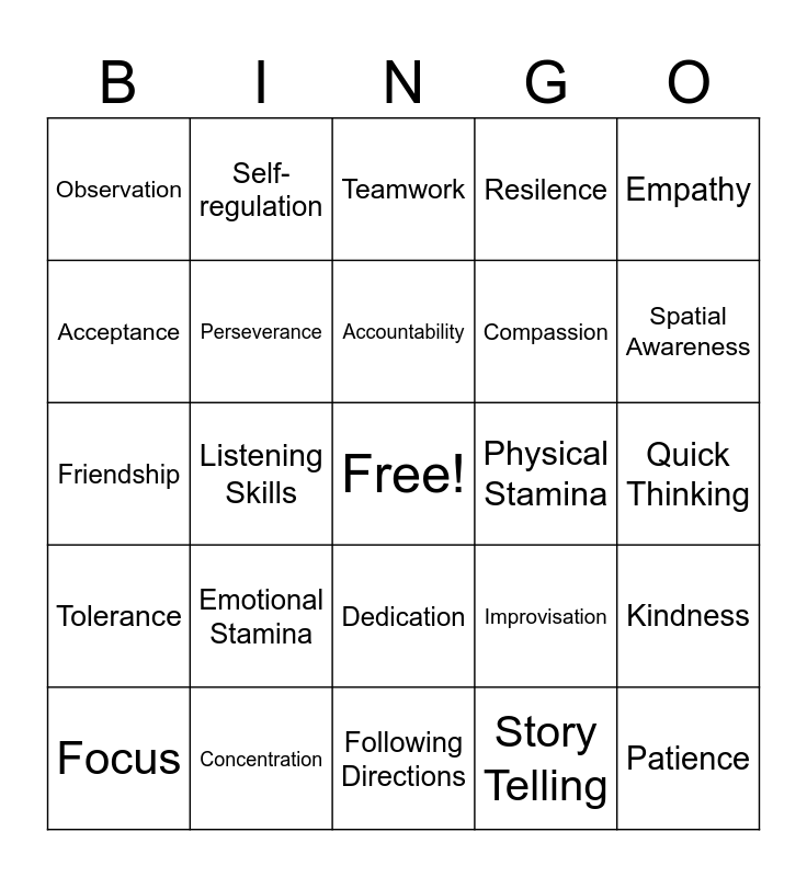 This bingo card has a free space and 39 words: Creativity, Confidence, Collaboration, Perseverance, Focus, Dedication, Accountability, Problem solving, Empathy, Tolerance, Listening Skills, Resilence, Patience, Quick Thinking, Physical Stamina, Emotional Stamina, Humility, Observation, Vocal Projection, Improvisation, Acceptance, Following Directions, Compassion, Spatial Awareness, History, Cultural Perspectives, Trust, Self Control, Resourcefulness, Self-regulation, Joy, Compromise, Teamwork, Concentration, Story Telling, Self-expression Concentration, Kindness, Friendship and Language & Vocabulary.