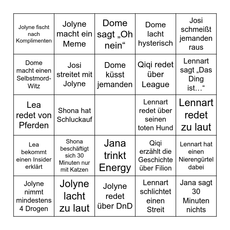 This bingo card has a free space and 24 words: Jolyne nimmt mindestens 4 Drogen, Shona beschäftigt sich 30 Minuten nur mit Katzen, Dome küsst jemanden, Lennart schlichtet einen Streit, Josi schmeißt jemanden raus, Jolyne fischt nach Komplimenten, Jolyne macht ein Meme, Dome sagt „Oh nein“, Lennart redet über seinen toten Hund, Lennart redet zu laut, Lea redet von Pferden, Josi streitet mit Jolyne, Qiqi erzählt die Geschichte über Filion, Lennart hat einen Nierengürtel dabei, Dome macht einen Selbstmord-Witz, Jolyne lacht zu laut, Jolyne redet über DnD, Dome lacht hysterisch, Lennart sagt „Das Ding ist…“, Lea bekommt einen Insider erklärt, Shona hat Schluckauf, Jana trinkt Energy, Qiqi redet über League and Jana sagt 30 Minuten nichts.