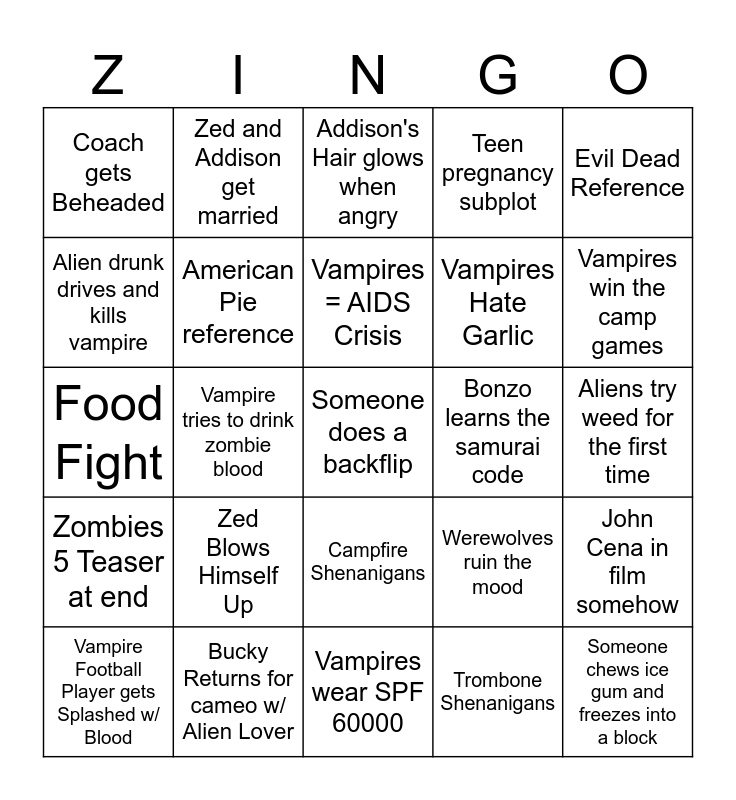 This bingo card has a free space and 24 words: Zed Blows Himself Up, Bucky Returns for cameo w/ Alien Lover, Vampires = AIDS Crisis, Vampire Football Player gets Splashed w/ Blood, Evil Dead Reference, Coach gets Beheaded, Alien drunk drives and kills vampire, Zed and Addison get married, Bonzo learns the samurai code, Campfire Shenanigans, Vampires Hate Garlic, Food Fight, Werewolves ruin the mood, John Cena in film somehow, American Pie reference, Trombone Shenanigans, Aliens try weed for the first time, Addison's Hair glows when angry, Vampires win the camp games, Vampire tries to drink zombie blood, Someone chews ice gum and freezes into a block, Zombies 5 Teaser at end, Teen pregnancy subplot and Vampires wear SPF 60000.