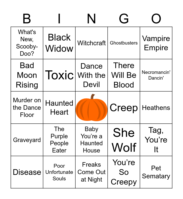 This bingo card has a free space and 35 words: Paint it Black, I Put a Spell on You, Monsters in My Mind, Toxic, Baby You’re a Haunted House, Ghostbusters, Bad Moon Rising, Halloweenie IV: Innards, Dance With the Devil, Cell Block Tango, Murder on the Dance Floor, Vampire Empire, This is Halloween, Somebody’s Watching Me, What's New, Scooby-Doo?, Creep, You’re So Creepy, Haunted Heart, Graveyard, Pet Sematary, She Wolf, Disease, Tag, You’re It, Poor Unfortunate Souls, Witchcraft, Necromancin' Dancin', Sweet Dreams, Frankenstein, There Will Be Blood, Heathens, The Ballad of Mona Lisa, Freaks Come Out at Night, The Purple People Eater, Black Widow and Black Cat.