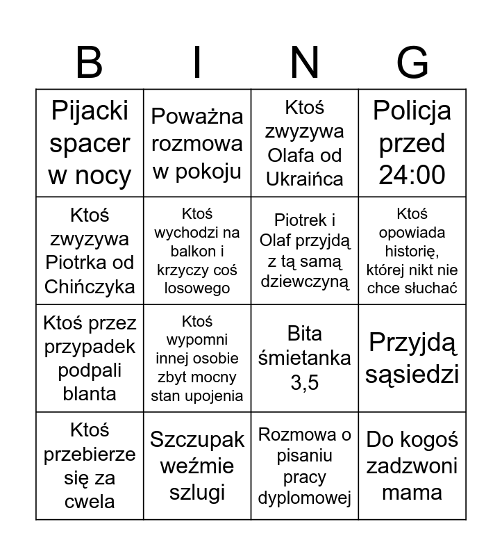 This bingo card has 16 words: Szczupak weźmie szlugi, Przyjdą sąsiedzi, Ktoś zwyzywa Olafa od Ukraińca, Pijacki spacer w nocy, Ktoś przez przypadek podpali blanta, Poważna rozmowa w pokoju, Bita śmietanka 3,5, Rozmowa o pisaniu pracy dyplomowej, Ktoś zwyzywa Piotrka od Chińczyka, Ktoś wychodzi na balkon i krzyczy coś losowego, Ktoś przebierze się za cwela, Policja przed 24:00, Ktoś wypomni innej osobie zbyt mocny stan upojenia, Ktoś opowiada historię, której nikt nie chce słuchać, Piotrek i Olaf przyjdą z tą samą dziewczyną and Do kogoś zadzwoni mama.