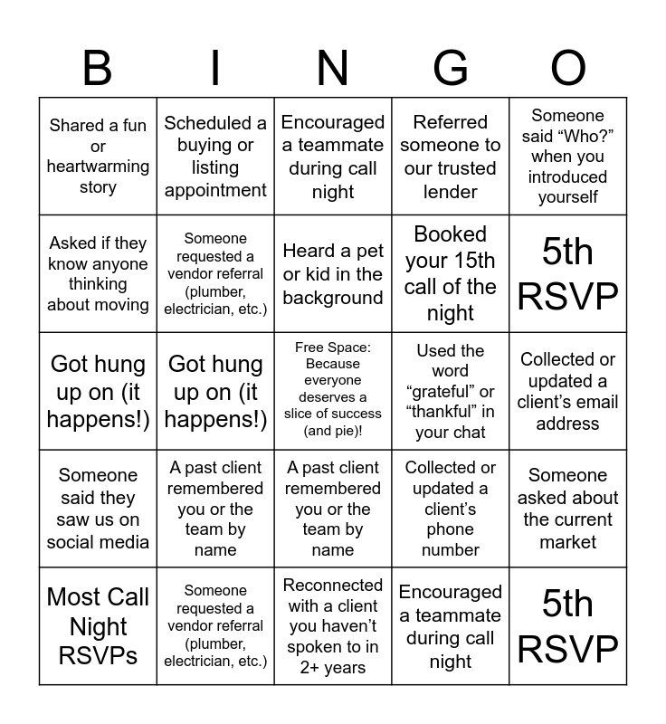 This bingo card has a free space and 49 words: 1st RSVP, 5th RSVP, Most Call Night RSVPs, Reconnected with a client you havenât spoken to in 2+ years, A past client remembered you or the team by name, Someone said they saw us on social media, Scheduled a buying or listing appointment, Got a referral, Asked if they know anyone thinking about moving, Asked for a Google review (and they said yes!), Someone requested a vendor referral (plumber, electrician, etc.), Referred someone to our trusted lender, Someone asked about the current market, Collected or updated a clientâs phone number, Collected or updated a clientâs email address, Made someone laugh, Heard a pet or kid in the background, Used the word âgratefulâ or âthankfulâ in your chat, Got a âthank you for callingâ, Someone said âWho?â when you introduced yourself, Got hung up on (it happens!), Encouraged a teammate during call night, Shared a fun or heartwarming story, Booked your 15th call of the night, 1st RSVP, 5th RSVP, Most Call Night RSVPs, Reconnected with a client you havenât spoken to in 2+ years, A past client remembered you or the team by name, Someone said they saw us on social media, Scheduled a buying or listing appointment, Got a referral, Asked if they know anyone thinking about moving, Asked for a Google review (and they said yes!), Someone requested a vendor referral (plumber, electrician, etc.), Referred someone to our trusted lender, Someone asked about the current market, Collected or updated a clientâs phone number, Collected or updated a clientâs email address, Made someone laugh, Heard a pet or kid in the background, Used the word âgratefulâ or âthankfulâ in your chat, Got a âthank you for callingâ, Someone said âWho?â when you introduced yourself, Got hung up on (it happens!), Encouraged a teammate during call night, Shared a fun or heartwarming story, Booked your 15th call of the night and Free Space: Because everyone deserves a slice of success (and pie)!.