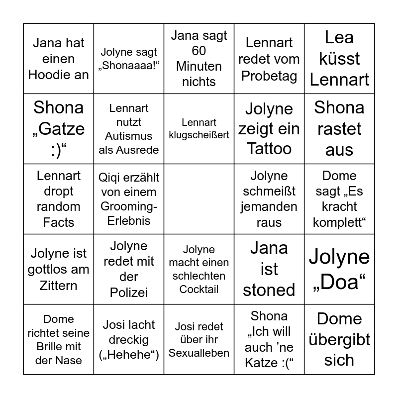 This bingo card has a free space and 24 words: Jolyne redet mit der Polizei, Josi lacht dreckig („Hehehe“), Lennart klugscheißert, Dome richtet seine Brille mit der Nase, Lea küsst Lennart, Jana hat einen Hoodie an, Shona „Gatze :)“, Jolyne sagt „Shonaaaa!“, Jolyne schmeißt jemanden raus, Jolyne macht einen schlechten Cocktail, Jolyne zeigt ein Tattoo, Lennart dropt random Facts, Jana ist stoned, Jolyne „Doa“, Lennart nutzt Autismus als Ausrede, Shona „Ich will auch ’ne Katze :(“, Dome sagt „Es kracht komplett“, Jana sagt 60 Minuten nichts, Shona rastet aus, Qiqi erzählt von einem Grooming-Erlebnis, Dome übergibt sich, Jolyne ist gottlos am Zittern, Lennart redet vom Probetag and Josi redet über ihr Sexualleben.