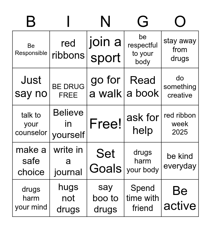 This bingo card has a free space and 26 words: Set Goals, Spend time with friend, go for a walk, hugs not drugs, stay away from drugs, Be Responsible, Just say no, red ribbons, red ribbon week 2025, drugs harm your body, Read a book, talk to your counselor, be kind everyday, drugs harm your mind, Believe in yourself, Make a new friend, be respectful to your body, make a safe choice, join a sport, Be active, do something creative, say boo to drugs, ask for help, write in a journal, BE DRUG FREE and Road Runner Champion.