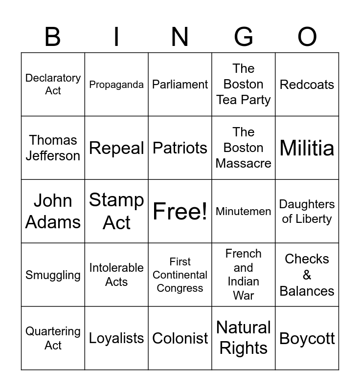 This bingo card has a free space and 33 words: Tarred & Feathered, Sugar Act, Stamp Act, Sons of Liberty, Smuggling, Repeal, Redcoats, Quartering Act, Propaganda, Proclamation Line of 1763, Patriots, Parliament, Ohio River Valley, No Taxation without Representation, Minutemen, Militia, Loyalists, John Adams, Intolerable Acts, French and Indian War, First Continental Congress, East India Tea Company, Declaratory Act, Daughters of Liberty, Colonist, Boycott, The Boston Tea Party, The Boston Massacre, Thomas Jefferson, Checks & Balances, Separation of Powers, Natural Rights and Unalienable Rights.