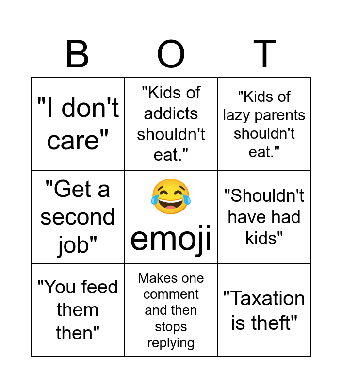This bingo card has a free space and 8 words: "Shouldn't have had kids", "Kids of lazy parents shouldn't eat.", "Kids of addicts shouldn't eat.", "You feed them then", "I don't care", "Taxation is theft", "Get a second job" and Makes one comment and then stops replying.