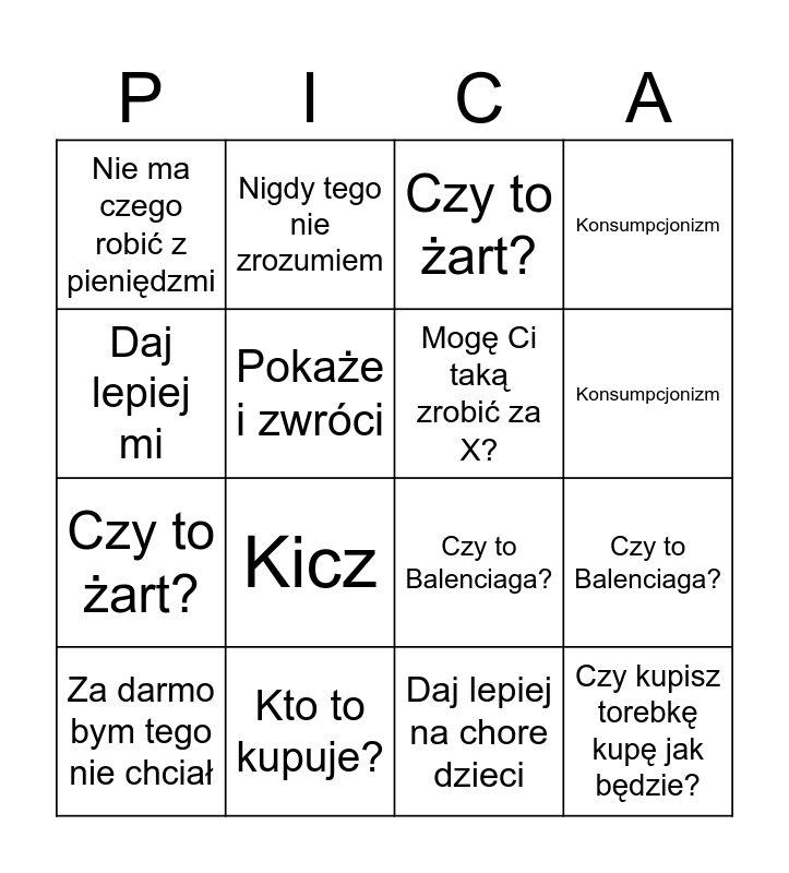 ⚠ This card has duplicate items: Eskperyment społeczny (2), Czy to Balenciaga? (2), Świat się kończy (2), Czy kupisz torebkę kupę jak będzie? (2), Mogę Ci taką zrobić za X? (2), Daj lepiej mi (2), Daj lepiej na chore dzieci (2), Nigdy tego nie zrozumiem (2), Za darmo bym tego nie chciał (2), Konsumpcjonizm (2), Czy to żart? (2), Pokaże i zwróci (2), Nie ma czego robić z pieniędzmi (2), Kto to kupuje? (2), Skąd masz pieniądze? (2)